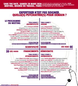 A l’heure où les équipes de psychiatrie publique sont remplacées par des plateformes d’orientation, où les moyens pour le soin psychique sont réduits de façon drastique, où les fermetures de lits et/ou de services sont de plus en plus nombreux, le collectif Printemps de la psychiatrie organise à Paris le samedi 28 mars 2026 un meeting autour de la question :